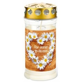 Motiv: "Margerite" Brenndauer: ca. 4 Tage Becherfarbe: weißÖlgehalt: 30 % Regenfester Deckel: Mit integrierten Ablaufrinnen im Deckel.